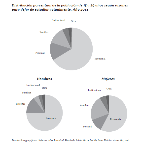 Esto se manifiesta también en las razones de inasistencia escolar: “adolescentes y jóvenes no permanecen en el sistema educativo principalmente por razones económicas; en las mujeres –además– cobran relevancia los motivos familiares” (Ídem). El siguiente gráfico describe la situación: