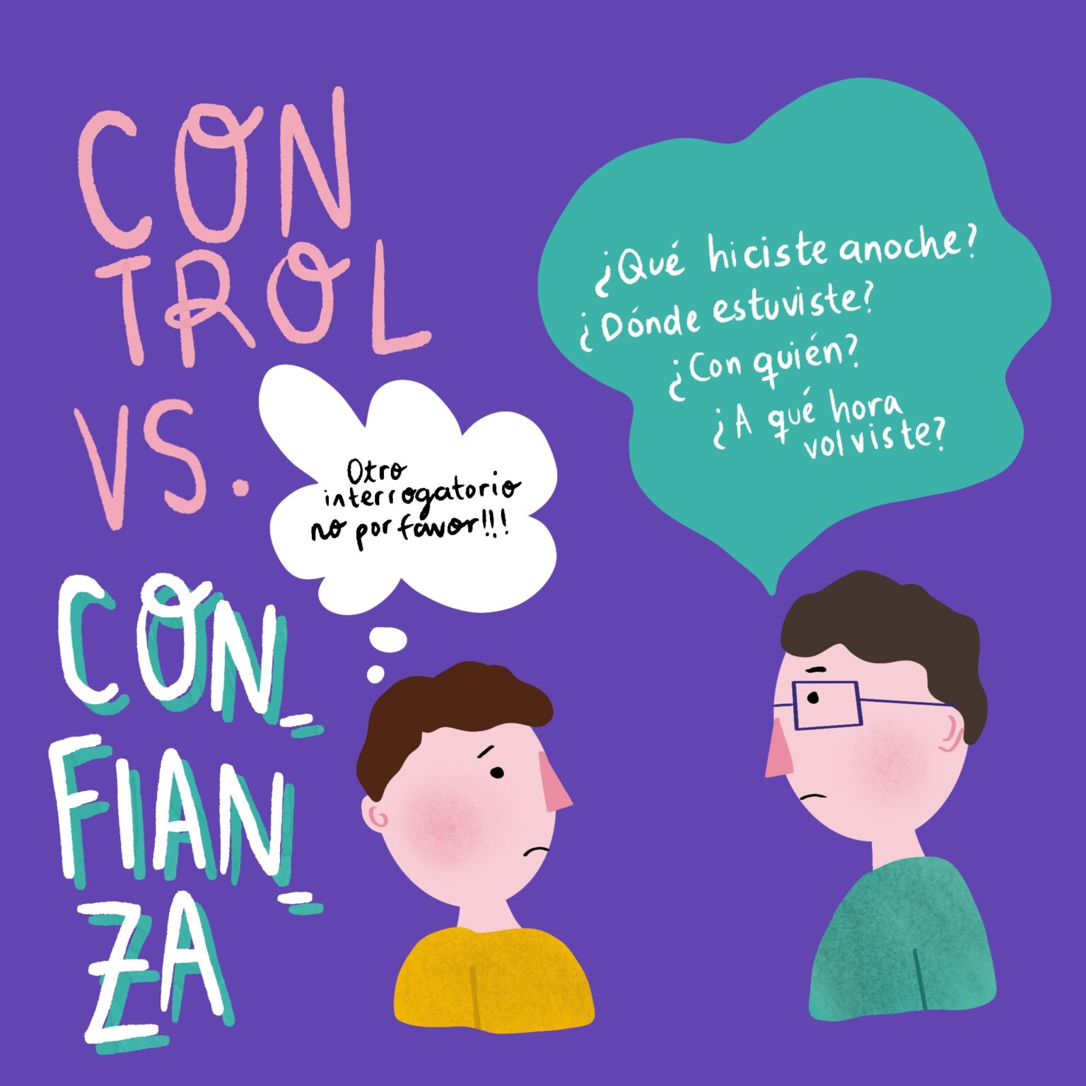 Los interrogatorios no nos brindan información sobre lo que viven, sienten, piensan, anhelan o temen los/as adolescentes. Para salirnos del hábito de interrogar y reemplazarlo por el de conversar, es preciso soltar el control. Porque el interrogatorio es una forma de control, tiene su origen en la desconfianza y pone al/a la adolescente bajo sospecha. De este modo, la mesa está servida para que estalle el conflicto.