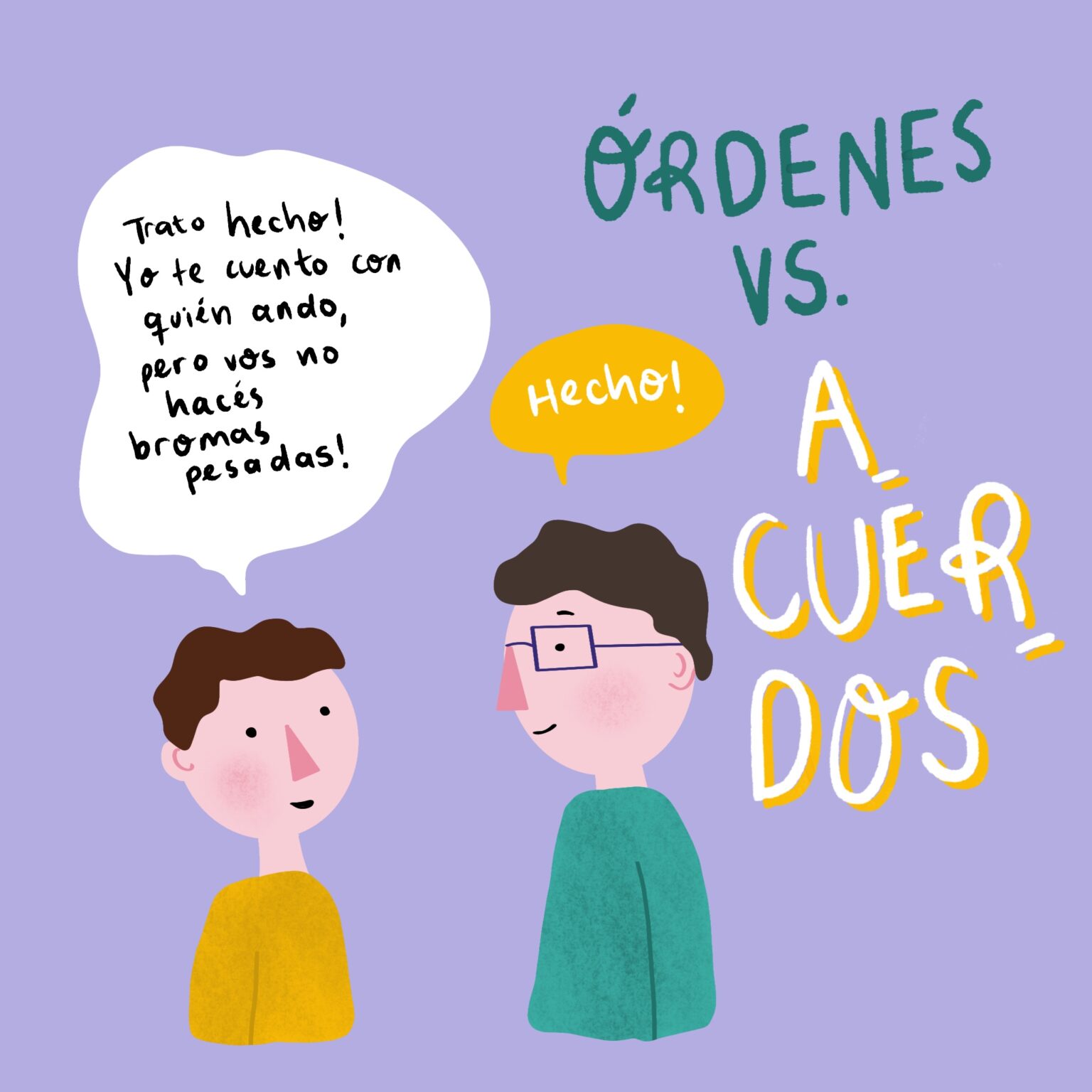 Una alternativa a las órdenes son los acuerdos. Llegar a un acuerdo significa que ambas partes se comprometen a algo en pos de encontrar lo mejor para las dos. El acuerdo implica que una parte cede y la otra también. Es un buen ejercicio de interés, empatía, confianza y respeto mutuo. Se puede pactar sobre horarios, salidas, hábitos, etc.