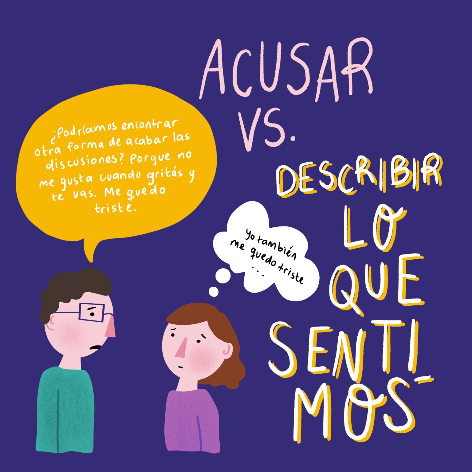 Expresar lo que sentimos, necesitamos o queremos puede ser una alternativa a las acusaciones, a los juicios o a poner etiquetas del tipo “sos un/una maleducado/a, desconsiderado/a, irrespetuoso/a, etc.”
