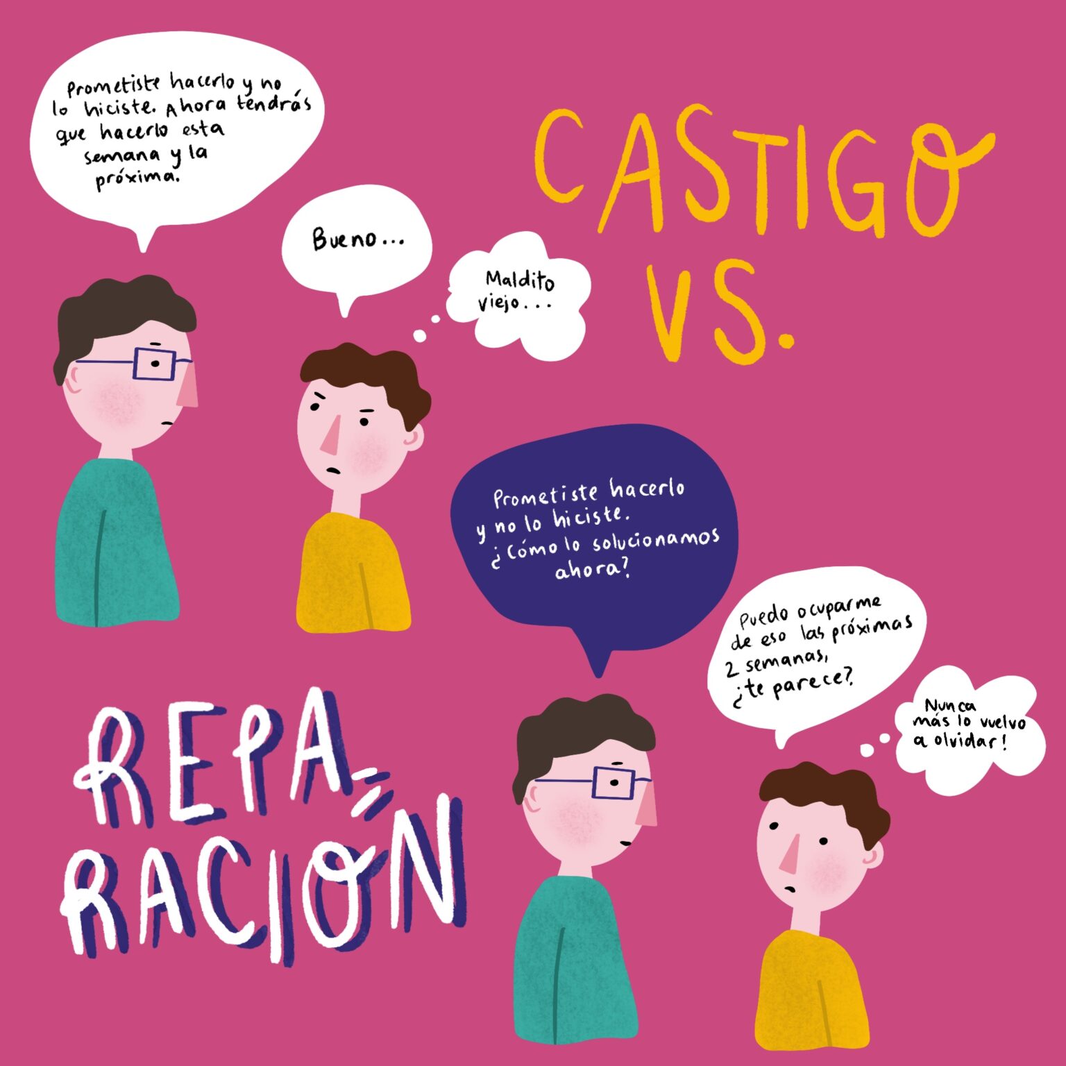 En lugar de castigar, podemos fomentar la idea de que todos nuestros actos y decisiones tienen consecuencias, de que somos responsables de las mismas y, por tanto, también de su reparación. La reparación no es un castigo, tampoco conlleva dolor, sufrimiento ni humillación. Se trata de que el/la adolescente asuma la responsabilidad de sus actos y repare el daño causado. Otra pista: Lo ideal sería que estas reparaciones, proporcionales a la falta cometida, sean establecidas de mutuo acuerdo.