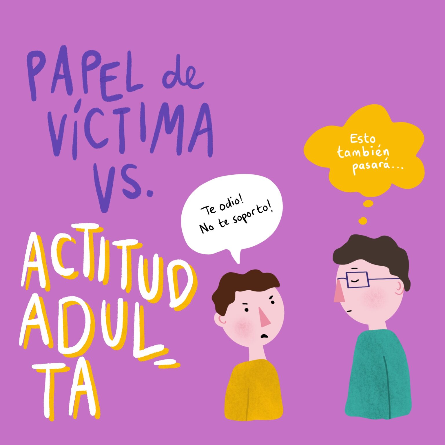 Aún si tu hijo/a llega a decir cosas que te ofenden o duelen, no significa que te dejó de querer. No te lo tomes personal. El/ la adolescente necesita romper con las estructuras y las figuras de autoridad para después poder reconfigurar o rearmar las suyas propias. Hacerte la víctima no ayuda a nadie y sólo empeora las cosas. Acordate de que el adulto sos vos.
