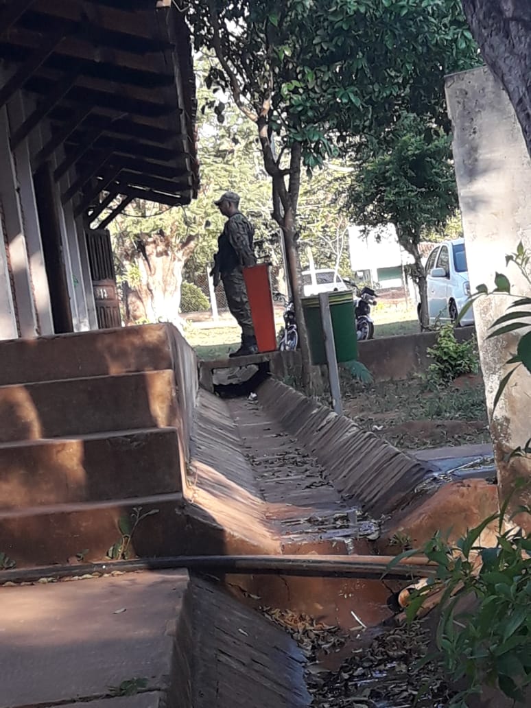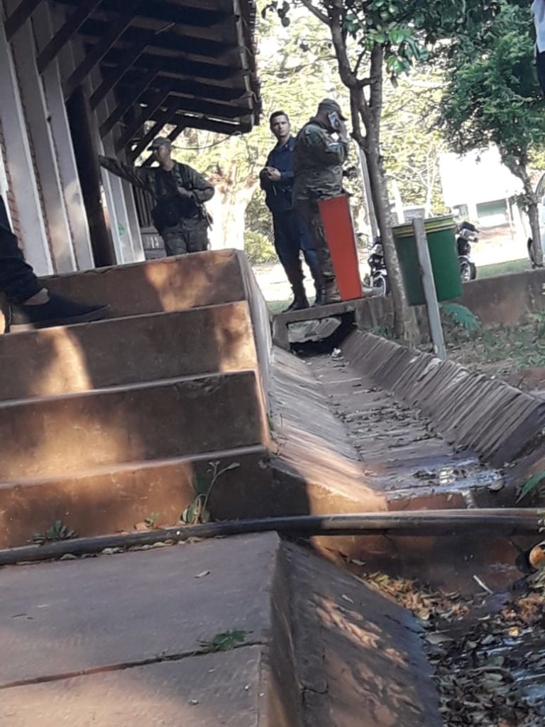 De acuerdo al relato de estudiantes y registros fotográficos, uno de los efectivos es de la Policía Nacional y los otros dos visten de para parara’i (camuflaje), por lo que podrían formar parte de la Fuerza de Tarea Conjunta (FTC), apostada en el departamento de Concepción.