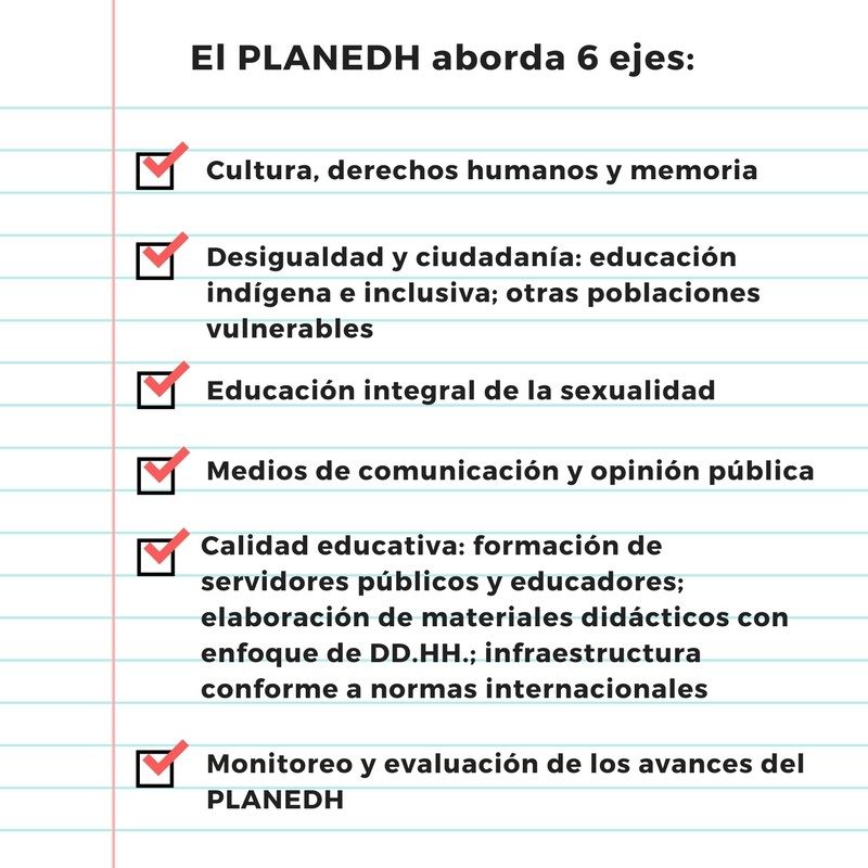 La importancia de esta Dirección radica en que esta es la instancia encargada de implementar real y efectivamente el PLANEDH, como herramienta que permitirá transversalizar la perspectiva de derechos humanos en la política educativa, a través de sus diversos planes y programas. No debe ser tomado como uno de los tantos planes que hay, sino debe ser el documento que marque las pautas generales para todos los planes. Esto significa pensar la gestión educativa, la cuestión docente, el currículum, los materiales educativos, los procesos de enseñanza-aprendizaje, la infraestructura, las relaciones, y vínculos a establecer desde los derechos humanos.Precisamente los 6 ejes centrales del PLANEDH son la propuesta para contrarrestar las pésimas condiciones que ha padecido la educación paraguaya a lo largo de su historia marcada por el autoritarismo, el pensamiento único, la exclusión social y la intolerancia a la diversidad.