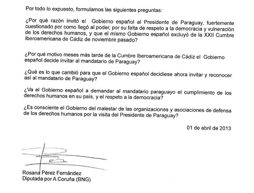 Ver copia facsímil Interpelacion al Congreso de los DiputadosEl documento oficial, firmado por la diputada Rosana Pérez Fernandez, del Grupo Parlamentario Mixto, expresa que “diversas organizaciones de defensa de la democracia y de defensa de los Derechos Humanos de Paraguay residentes en el Estado español y otros países europeos, así como organizaciones de solidaridad con américa Latina, han mostrado su malestar por la invitación del Gobierno español al Presidente de Paraguay que inicia una visita el martes 2 de abril”. Al final del documento la diputada arroja 5 preguntas directas y penetrantes: ¿Por qué razón invitó el Gobierno español al Presidente del Paraguay, fuertemente cuestionado por cómo llegó al poder, por su falta de respeto a la democracia y vulneración de los derechos humano, y que el mismo Gobierno español excluyó de la XXII Cumbre Iberoamericana de Cádiz de noviembre pasado? ¿Va el Gobierno español a demandar al mandatario paraguayo el cumplimiento de los derechos humanos en su país, y el respeto a la democracia? Para estas y otras interpelaciones, la congresista solicita respuesta por escrito.