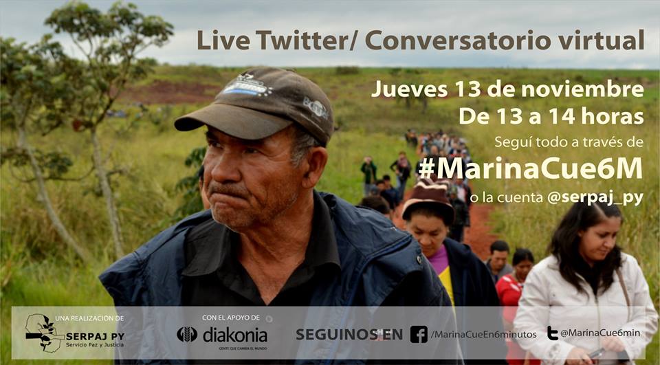 Se podrá ver y participar a través Twitter y será este jueves 13 de noviembre de 13 a 14 horas. Se realizará un conversatorio virtual que abordará el caso de las tierras de Marina Cué. La actividad se hará a través de la red social Twitter y podrán verse todas las interacciones a través del hashtag #MarinaCue6M o en la cuenta @serpaj_py La actividad es organizada por el Servicio Paz y Justicia Paraguay (Serpaj Py), con el apoyo de Diakonia.